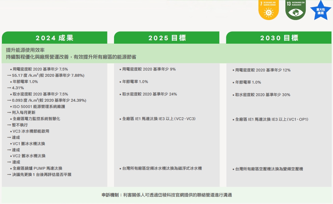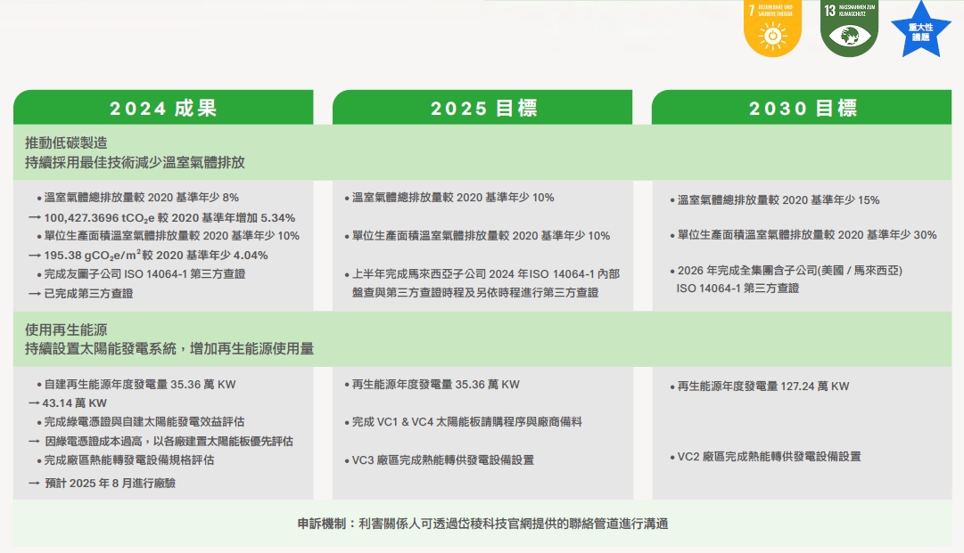 2024 年針對後續三年再生能源目標,除針對熱電聯產設備完成採購下單外,也增列太陽能板資本支出,預計於 2025 年完成熱電聯產設備之設置與太陽能板之採購,減低公司整體電力耗用量。