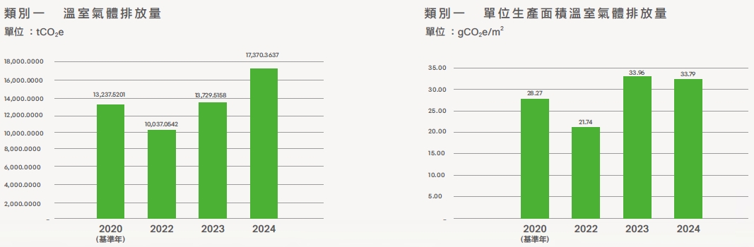 3. 直接排放量(類別一) 之盤查清冊結果,2024 年溫室氣體排放量為 17,370.3637 tCO2e,較 2023 年 13,729.5158 tCO2e 增加 26.52%,較 2020 基準年增加 31.22%,主要受到 2024 年客戶訂單需求增加及產品變動造成類別一排放量增加;2024 年單位生產面積溫室氣體排放量為 33.79 gCO2e/m2,較 2023 年 33.96 gCO2e/m2 減少 0.50%,較 2020 基準年增加 19.53%。