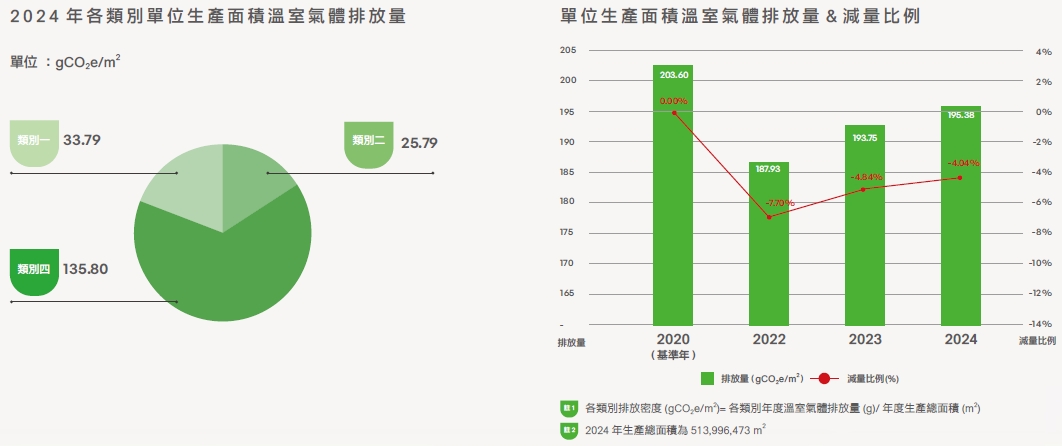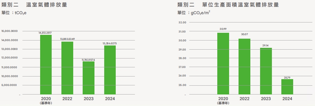 2024 年單位生產面積溫室氣體排放量為 195.38 gCO2e/m²,較 2023 年 193.75 gCO2e/m² 增加 0.84%,較 2020 基準年減少 4.04%,未達到年度減排目標主要受 2024 年客戶訂單增加及產品別變動影響。雖未達到目標,但由於近年來在各項節能措施持續推展下,類別二的溫室氣體排放密度已見初步減碳成效,2025 年將透過每季例行性節能減碳會議,針對各類別減碳措施審視成效,以確保達到溫室氣體減量目標。