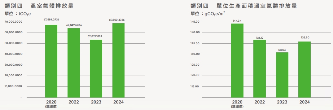 3. 間接排放量(類別四) 之盤查清冊結果,2024 年溫室氣體排放量 69,800.4786 tCO2e,較 2023 年 52,821.1087 tCO2e 增加 32.15%,較 2020 基準年增加 3.28%;單位生產面積溫室氣體排放量為 135.80 gCO2e/m²,較 2023 年 130.65 gCO2e/m² 增加 3.94%,較 2020 基準年減少 5.92%。2024 年因客戶需求增加,造成類別四溫室氣體的排放量增加,後續仍以減少單位原物料使用量及回收再利用來降低類別四之排放量。