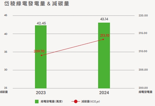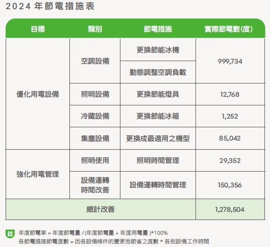 2024 年岱稜科技主要透過用電效率提升來達成減碳目標,在電力使用量上 2024 年共節省 1,278,504 度,年度節電率為 4.31%,相對減少類別二排放量 631.58 tCO2e。
