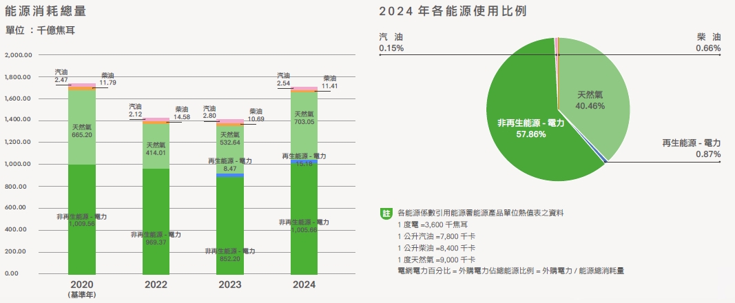 其中電力主要作為供應生產設備及廠務系統運轉使用,天然氣用於鍋爐與防制設備,柴油使用於堆高機、緊急發電機及消防幫浦,汽油則用於公務車使用。