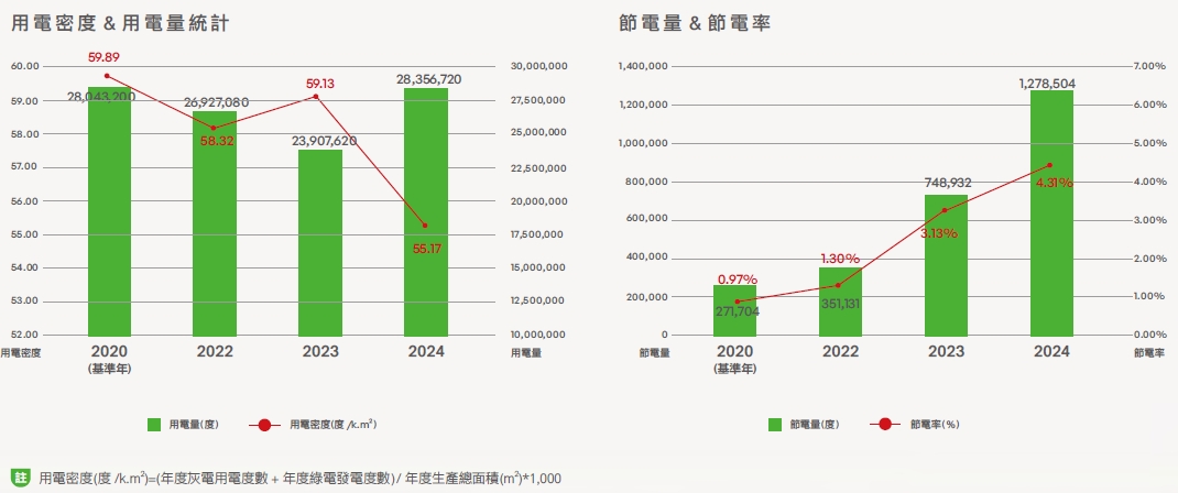 2024 年共耗用 28,356,720 度,用電密度為 55.17 度/k.m²,較 2020 基準年用電密度 59.89度/k.m² 降低 7.88%,較 2023 年用電密度 59.13 度/k.m² 下降 6.70%,雖因客戶需求增加致用電度數增加,但在 2024 年新購入機台持續啟用狀況下,整體用電狀況搭配年度節能計劃,目前仍符合能源管控之階段性目標。