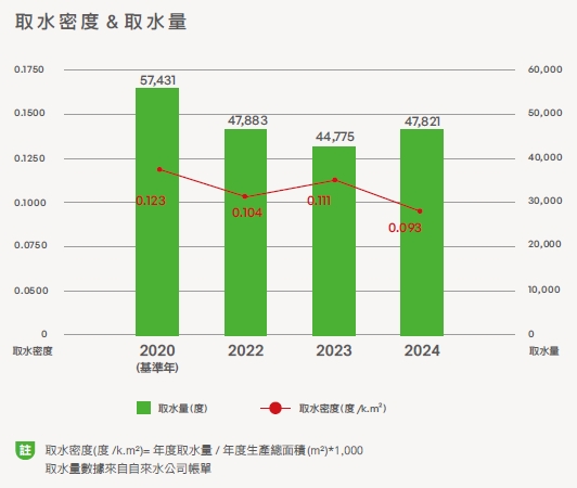 2024 年完成全廠區水資源平衡圖,定期監控用水量並將自來水系統巡檢納入 FEMS 系統,定期針對各廠區自來水錶頭、管路狀況、PUMP 運轉、水塔液位進行巡視與全廠區冰水系統洩漏防堵改善,減少自來水不當之浪費。2024 年取水量為 47,821度(47.82 百萬公升),取水密度 0.093 度/k.m²,取水密度較 2020 基準年下降 24.39%(2020 年為 0.123 度/k.m²),較 2023 年下降 16.22% (2023 年為0.111度/k.m2)。2024 年取水密度較 2020 基準年大幅下降,主要為既有設備漏水防制改善外,同時在整體生產的用水效率提升所致。在 2024 年實際目標已達 2030 年目標狀況下,重新修正 2025 年及 2030 年目標,以符合現行實際狀態,2025 年目標變更為較 2020 基準年下降 24%、 2030 年較 2020 基準年下降 30%。