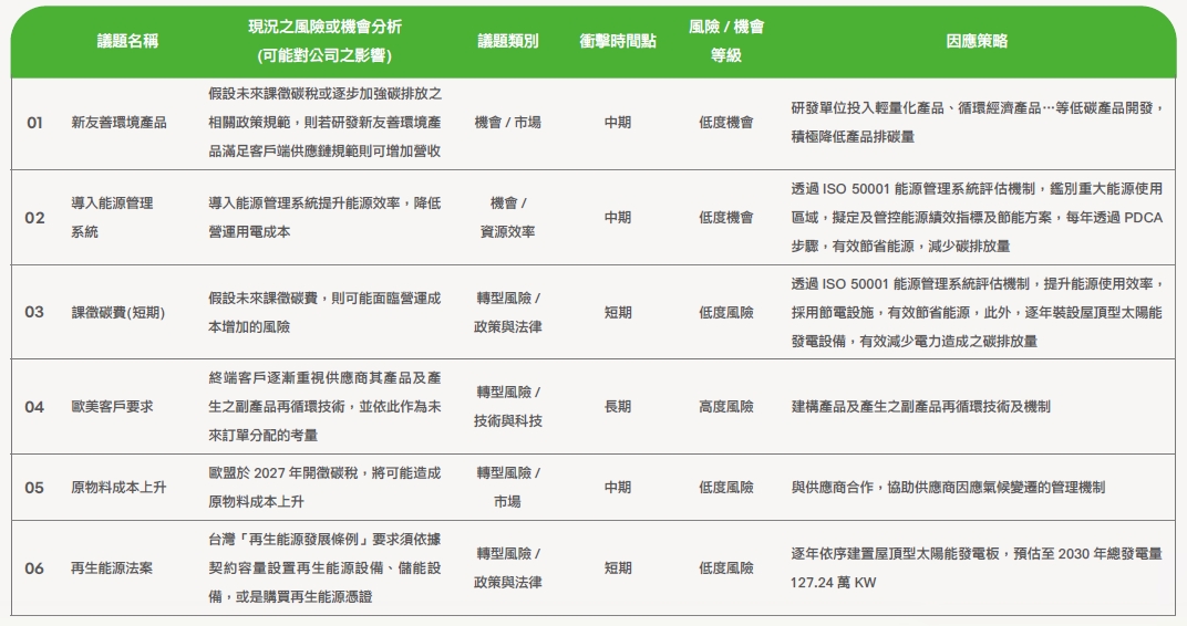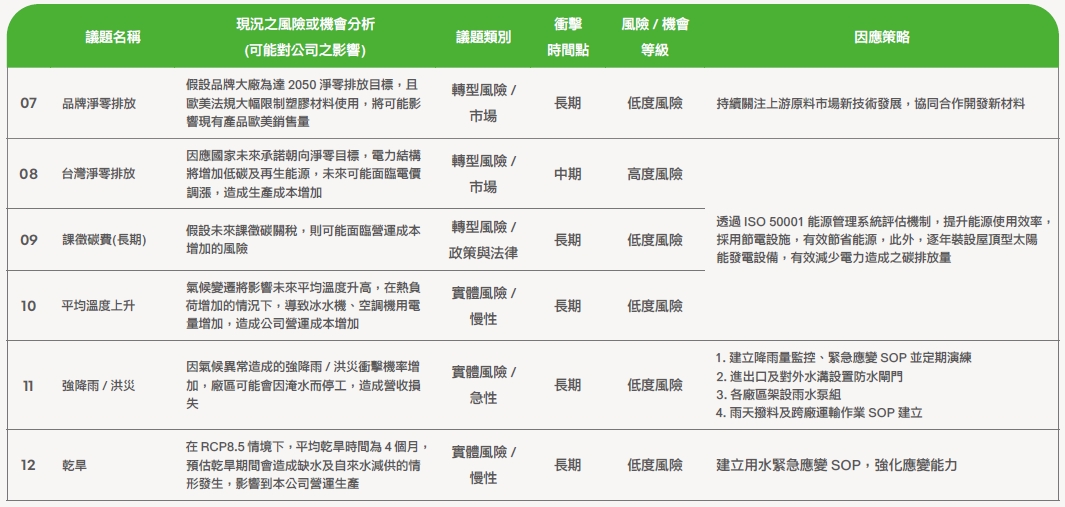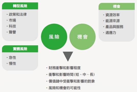 擬定機會情境時,考量資源效率、能源來源、產品與服務、市場及適應力,並對可能發生之事件進行包含財務影響程度、影響時間(短、中、長期)、價值鏈中受影響對象、機會可能性等機會評估。