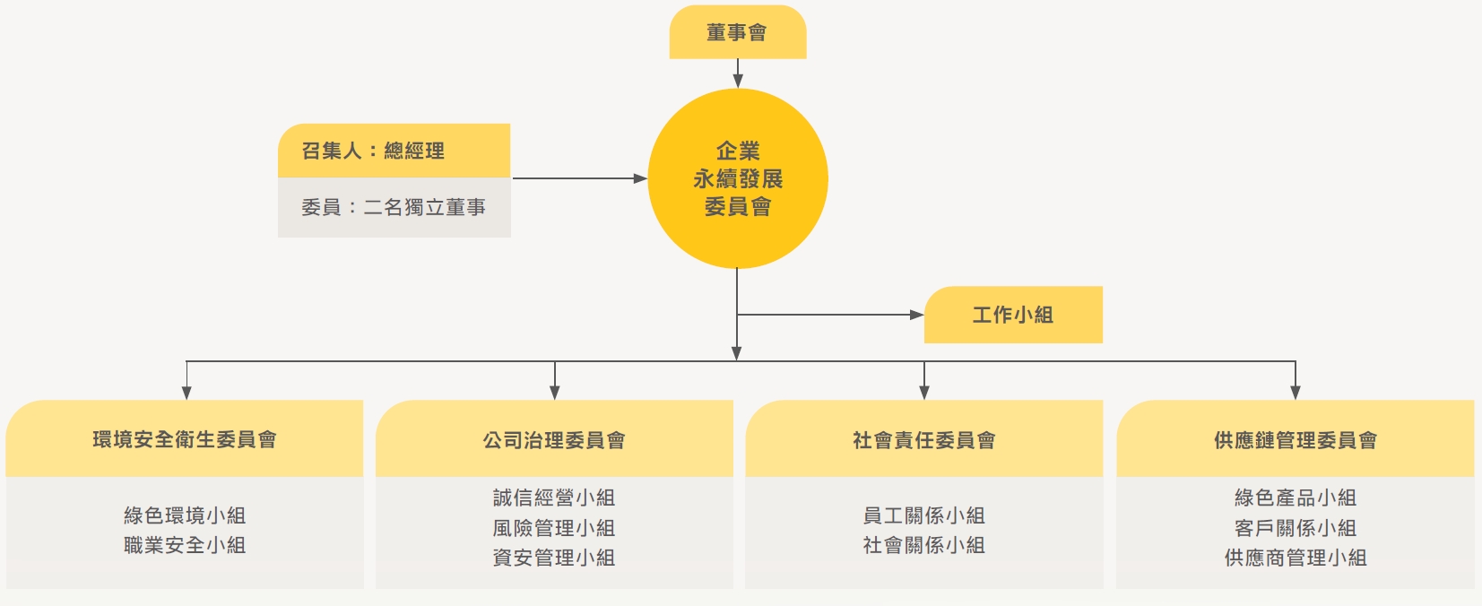 為持續推動永續經營與強化公司治理,實踐永續發展之統籌管理,岱稜科技於 2021 年成立隸屬於董事會下之「企業永續發展委員會」,合併原有「企業社會責任委員會」,持續針對經濟、環境與社會議題等推動結果進行整合,並在年度企業永續報告書編製完成後,將檢視當年度執行所有利害關係人,鑑別出對公司影響較大之經濟、環境和社會主題及其衝擊、風險與機會等評估結果、相對應之管理對策及報告書發行,一年兩次向董事會呈報且核可後發佈於公司官網,提供利害關係人相關資訊;另外同時利用廠內公告及入口網站公告欄位向員工宣導企業責任相關活動及員工行為準則。