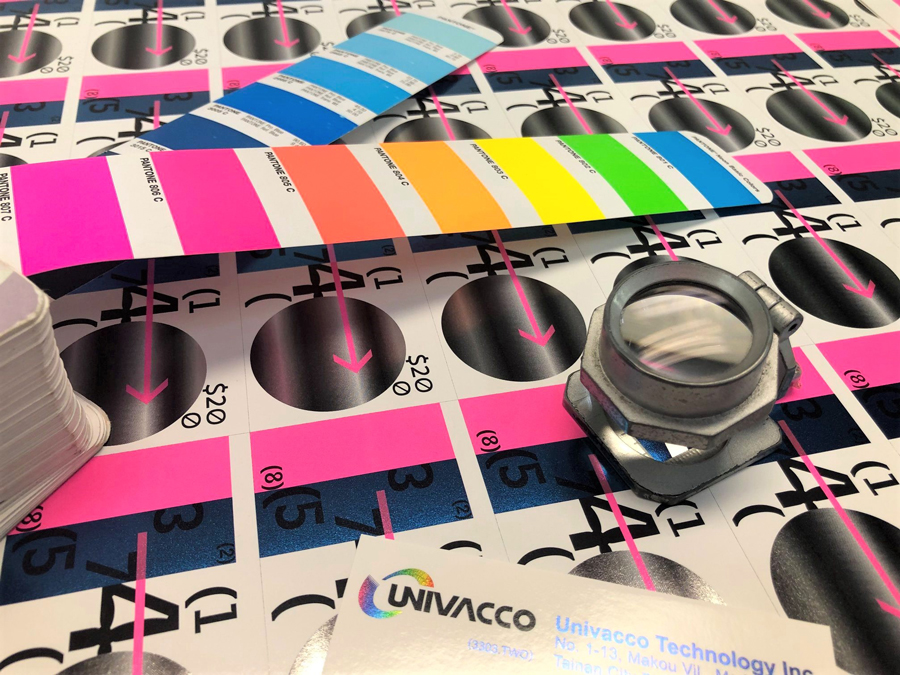 冷烫占了印刷机两道色座(一座冷烫胶、一座是冷烫箔),加上CMYK的四色座,以及上光两座,意即总共八座。当设计师的作品要玩多色的Pantone专色,须考量印刷机色座是否充足。但是换个角度思考,冷烫色也是一种专色,可以玩出很厉害的颜色喔!