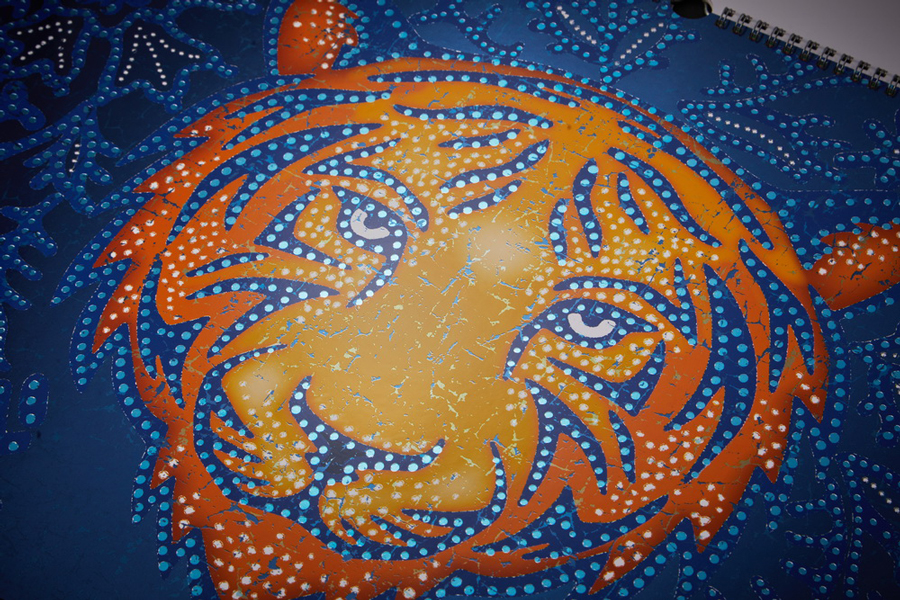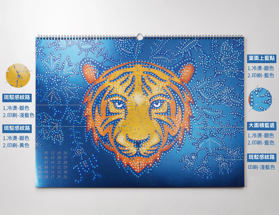 画面中心的老虎本身,虽然只是单纯印刷,但透过蓝色冷烫的圆点,将老虎的样貌生动地勾勒出来,加上老虎的脸上有许多不规则的冷烫线条,使用蓝色冷烫和黄色冷烫交错呈现斑驳效果,搭配得唯妙唯肖。