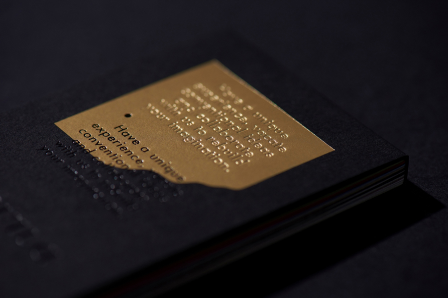 如同这款设计色卡的封面,在黑纸上以MG81F浅雾金烫印大面积,营造烫金箔正在撕开的视觉体验。